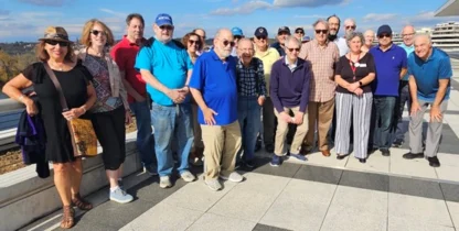 Twenty-five Men’s Club members and guests toured the John F. Kennedy Center for the Performing Arts. Our knowledgeable guide, Maria, took us all over the beautiful building, inside and out, and gave us extensive information regarding the history and construction of the Center. We had to dodge numerous school buses to get in, because the National Symphony was hosting 4th graders from Fairfax public schools. In the main Kennedy Center Building, we visited several theaters, the Halls of States and nations, and the outside Terrace. Also, during the tour, we had to take refuge in the Israeli Lounge to avoid mixing with hundreds of nine-year-olds. However, Maria took the opportunity to emphasize the Jewish connection with the development of the Kennedy Center.